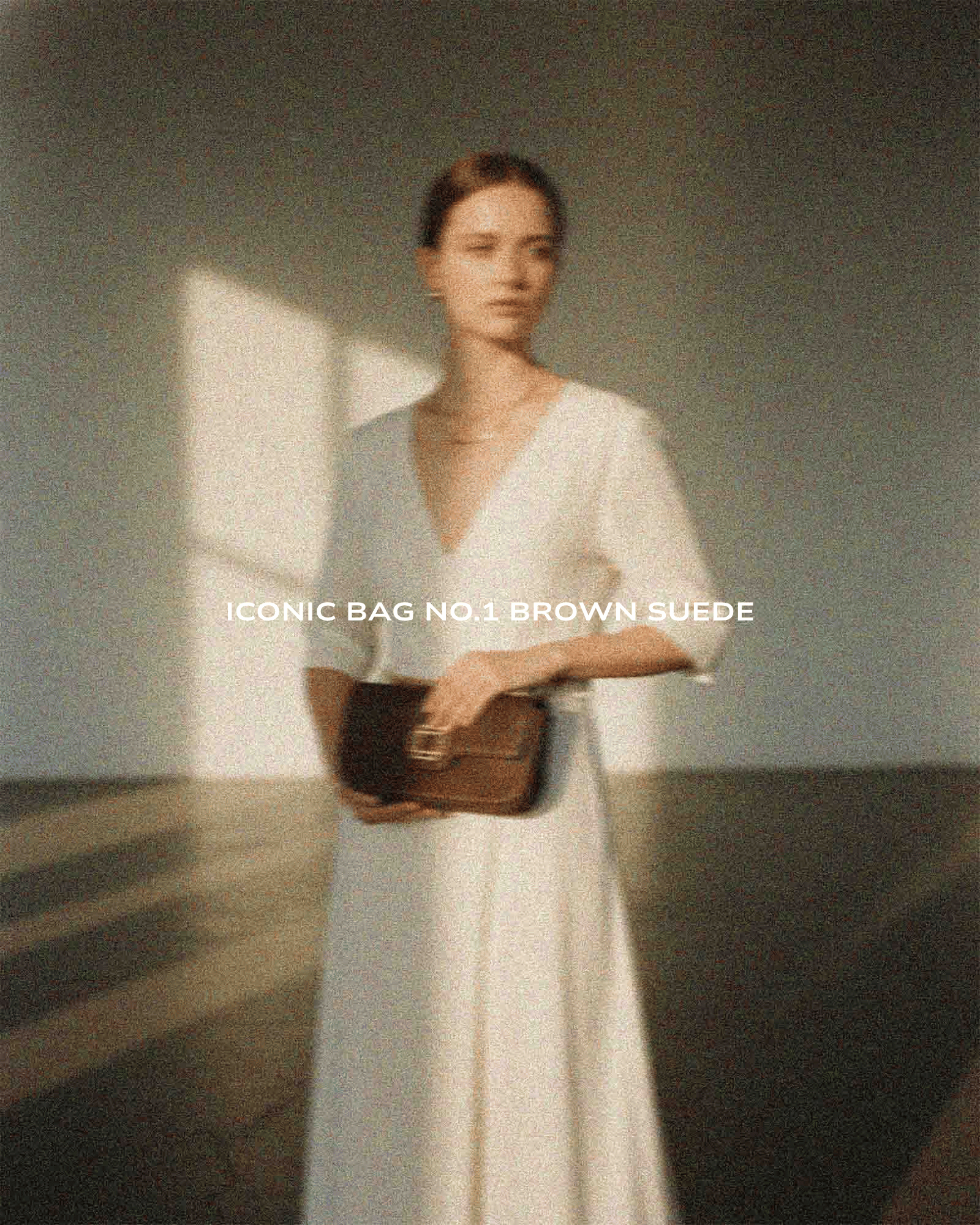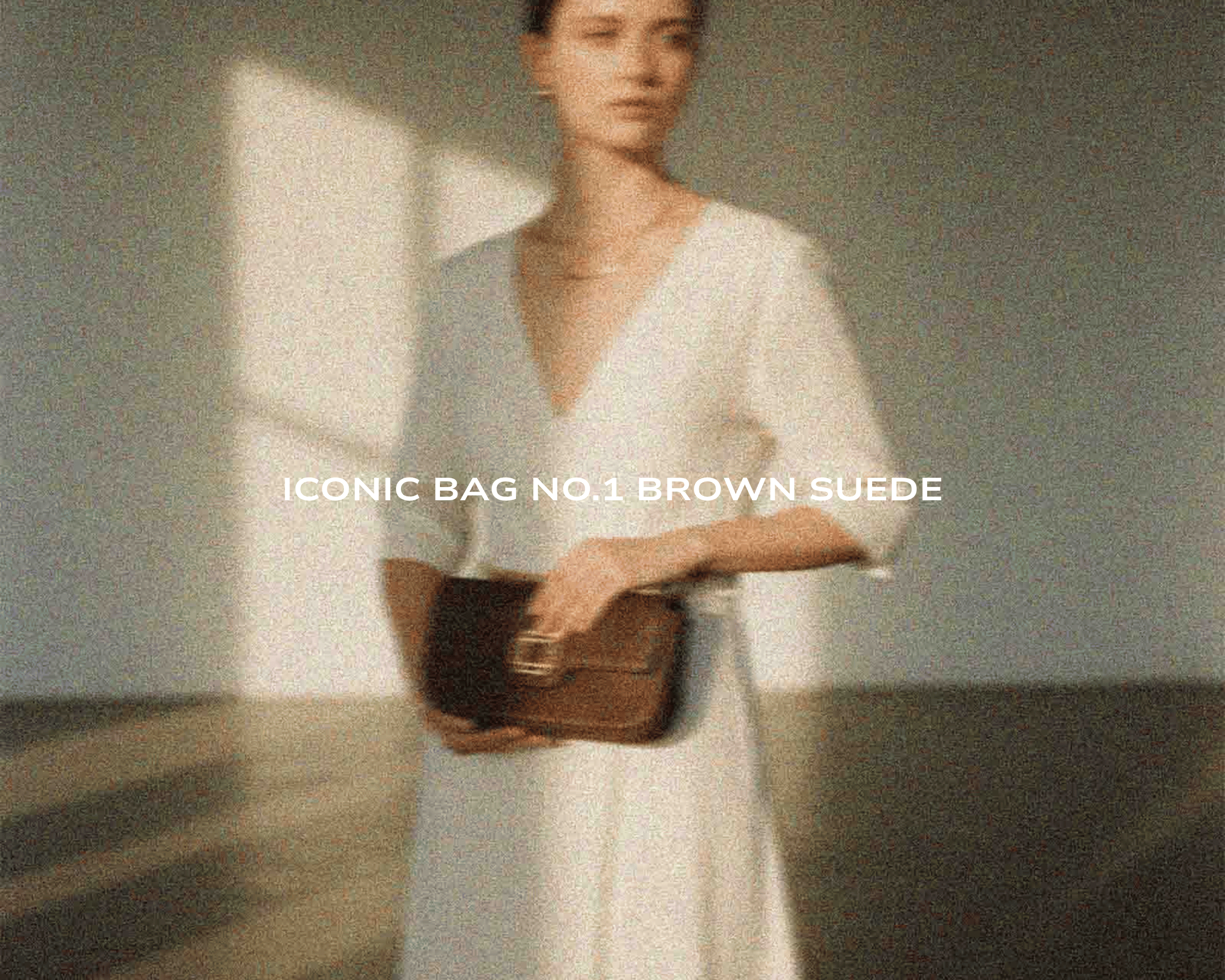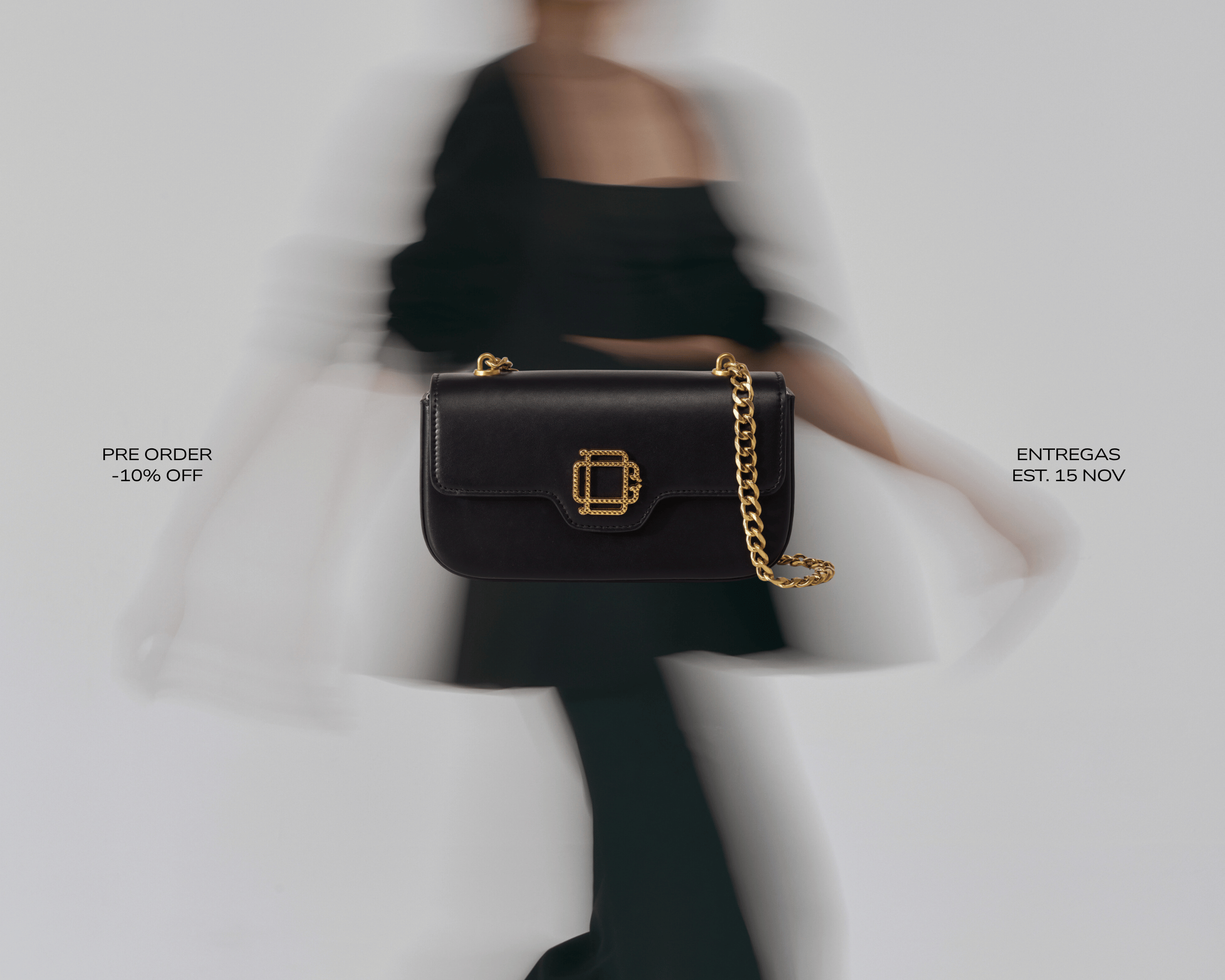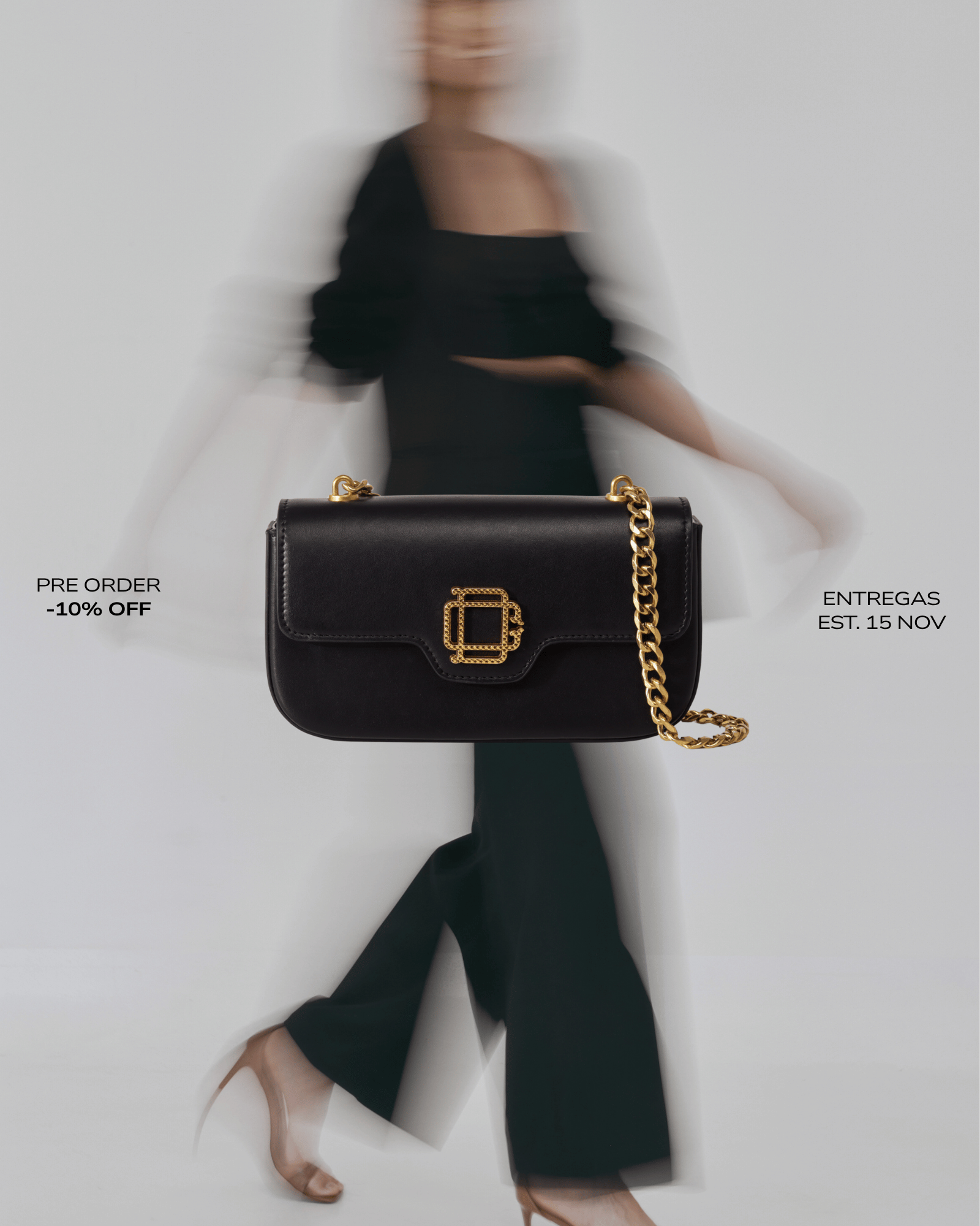 Bolso Iconic Bag No.1 en cuero vegano genuino liso con cadena metálica dorada y logo grabado en metal dorado. Su diseño versátil lo hace ideal para el día o la noche.